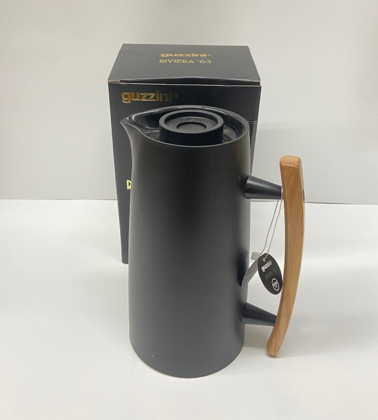 The 34oz Black Thermal Coffee Carafe is a stylish and practical vacuum flask that can keep your beverages hot or cold for extended periods of time. With a solid black color and a sleek design, this flask features a pouring button and a lid lock for easy access. Made from BPA-free materials, wood, glass, and plastic, it is both durable and safe for use. The large 1 LTR capacity makes it perfect for serving adult-sized beverages, and the machine washable care instructions ensure easy maintenance. This Guzzini flask is a versatile and reliable option for storing and transporting your favorite hot or cold drinks.